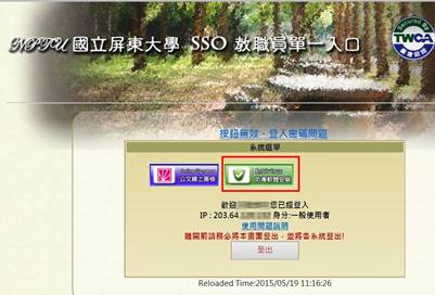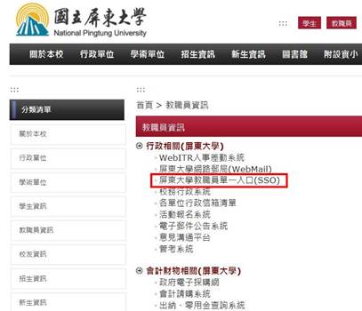 至學校首頁「教職員資訊」網頁點選「屏東大學教職員單一入口(SSO)」