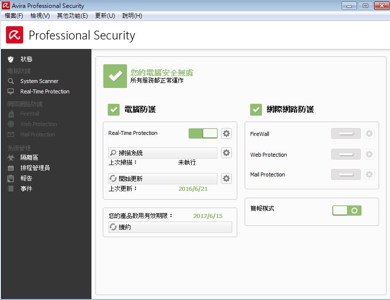 7. 最後此圖出現「你的產品啟用有限期限:2017/6/15」及”上次更新”的日期是今天時,表示安裝成功。